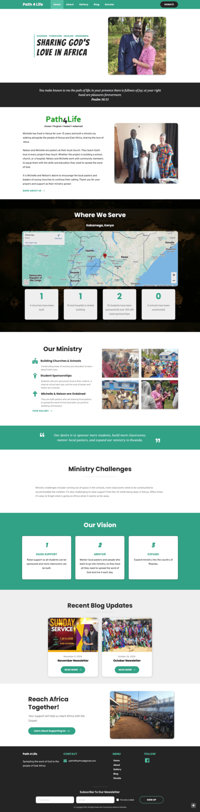 Path 4 Life Africa is a non-profit organization dedicated to sharing God’s love in Africa by building churches and schools and sponsoring students. Michelle and Nelson, who are pastors at their local church, teach God’s love in every project they touch.