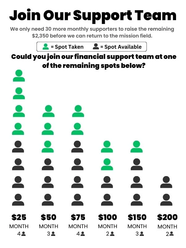 As we embark on this life-changing expedition, we seek your partnership in prayer and support. Your prayers are indispensable; they uphold us and pave the way for God’s work to unfold in remarkable ways. Additionally, financial contributions will help cover essential expenses, including [detail specific needs like housing, language learning, ministry supplies, etc.].